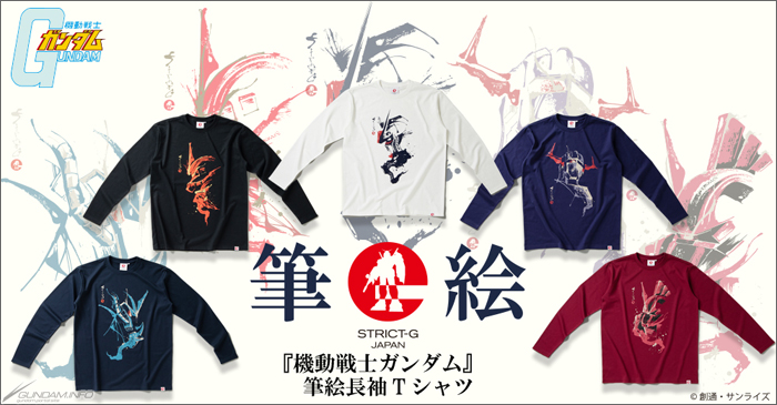 เสื้อยืดแขนยาวลายพู่กัน STRICT-G JAPAN JAPAN ห้าแบบจาก STRICT-G ร้านเสื้อผ้าที่ผสมผสานโลกของกันดั้มเข้าด้วยกัน จะวางจำหน่ายในวันเสาร์ที่ 18 มีนาคม โดยจะวางจำหน่ายตัวละละ 8,030 เยน (รวมภาษี