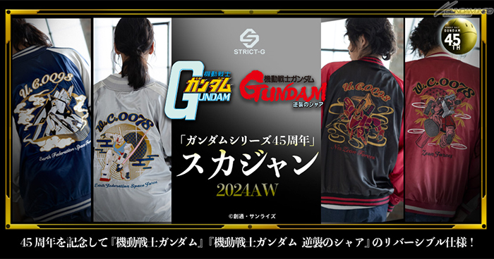 พรีออเดอร์เสื้อแจ็คเก็ต Sukajan ฉลองครบรอบ 45 ปีซีรีส์ Gundam ของ STRICT-G สองแบบเริ่มขึ้นเมื่อเวลา 13.00 น. (JST) ของวันศุกร์ที่ 20 กันยายน ที่ร้านค้าออนไลน์ STRICT-G ในเครือ Premium Bandai โดยแต่ละแบบวางจำหน่ายในราคาตัวละ 35,200 เยน (รวมภาษี)