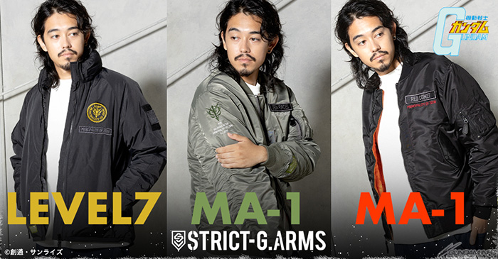 STRICT-G.ARMS เป็นซีรีส์ที่นำเสนอสินค้าแฟชั่นที่สนุกสนานสำหรับการใช้งานในชีวิตประจำวัน โดยมีแนวคิดว่าผู้คนในยุค Universal Century คือประวัติศาสตร์ที่เกิดขึ้นจริง และนำเสนอความรู้สึกทางทหารที่แท้จริง การเปิดตัวใหม่ประกอบด้วยเสื้อแจ็คเก็ต LEVE7 ที่มีลักษณะของชั้นนอกสุดของระบบเสื้อผ้าสำหรับสภาพอากาศหนาวเย็น (ECWCS) และแจ็คเก็ต MA-1 สองตัวที่มีการออกแบบที่แข็งแกร่งและแท้จริงเป็นครั้งแรกในคอลเล็กชัน STRICT-G.ARMS
