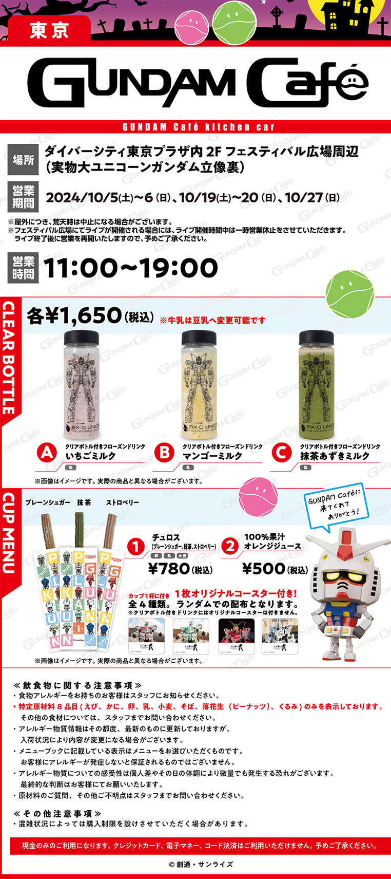นอกจากนี้ ยังมีการประกาศด้วยว่าฟู๊ดทรัค GUNDAM Café จะเปิดให้บริการด้านหลังประติมากรรม Life-sized Unicorn Gundam ในกรุงโตเกียว ในวันเสาร์ที่ 5 ตุลาคม วันอาทิตย์ที่ 6 ตุลาคม วันเสาร์ที่ 19 ตุลาคม วันอาทิตย์ที่ 20 ตุลาคม และวันอาทิตย์ที่ 27 ตุลาคม โดยรถขายอาหารจะเสิร์ฟเครื่องดื่มแช่แข็งในขวดใสที่มีดีไซน์ประติมากรรม Life-sized Unicorn Gundam ถ้วยชูโรส และน้ำส้มคั้นแท้ 100% พร้อมที่รองแก้วแบบออริจินัล