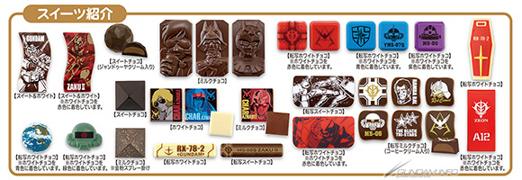 ช็อกโกแล็ตนั้นมีแบบมาจาก Mobile Suit Gundam และมาในห่อกระดาษมันเงาสวยงาม ชุดสินค้านี้ประกอบไปด้วยไอเทมแปดแบบ: Gundam Mini Gift Set, Char Chocolate Set, One Year War Chocolate Gift Set, Red Comet Char Exclusive Chocolate Can, Char VS Gundam Chocolate Gift Set, Black Tri-Stars Chocolate Can, Blue Giant Ramba Ral Chocolate Can, และ Gundam Engraving Can.