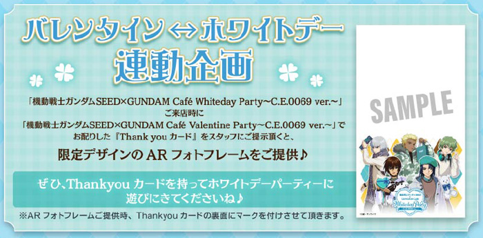 ถ้าแค่นั้นยังไม่พอ ผู้มาเยือนที่แสดงการ์ดขอบคุณจากงาน SEED x GUNDAM Café Valentine Party ~C.E.0069ver.~ กับสตาฟจะสนุกไปกับเฟรม AR Photo Frame อีกใบให้ใช้ในร้านในฐานะส่วนหนึ่งของการฉลองร่วมระหว่างวันวาเลนไทน์/ไวท์เดย์ อย่าลืมที่จะนำการ์ดขอบคุณเพื่อเข้าร่วมในงานนี้พร้อมกับปาร์ตี้วันไวท์เดย์กันล่ะ!