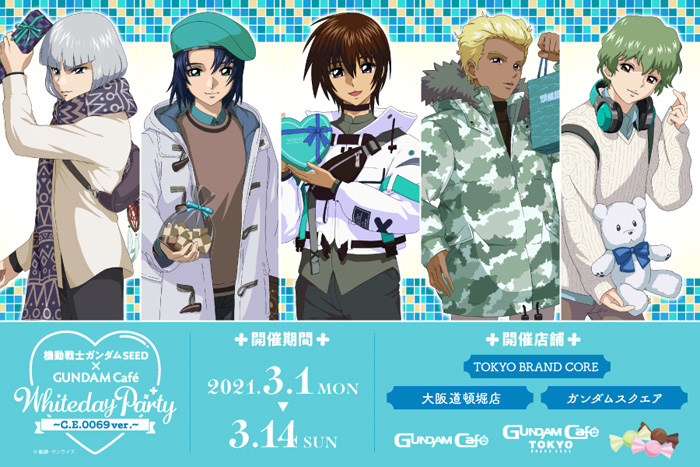 งาน Gundam SEED x GUNDAM Café Whiteday Party ~C.E.0069ver.~ จะถูกจัดที่ GUNDAM Café TOKYO BRAND CORE (GUNDAM Café TOKYO), GUNDAM Café Osaka Dotonbori, and GUNDAM SQUARE ในโอซาก้าตั้งแต่วันจันทร์ที่ 1 มีนาคม!