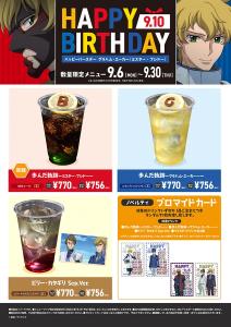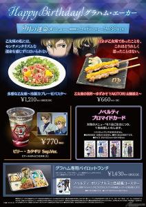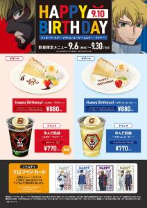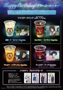 เมนูจำนวนจำกัด (ของหวานและเครื่องดื่ม) เฉลิมฉลอง วันที่ 10 กันยายน วันเกิดของ Graham Aker (Mr. Bushido) จาก Mobile Suit Gundam 00 จะวางจำหน่าย ผ่านช่วงกิจกรรม จะมีเมนูไอเท็มพิเศษที่ทำเป็นลวดลายที่โด่งดัง Graham และ Bushido รวมถึงเครื่องดื่มจาก 5 ตัวละคร ที่เกี่ยวข้องกับเขา เช่น Billy Katagiri