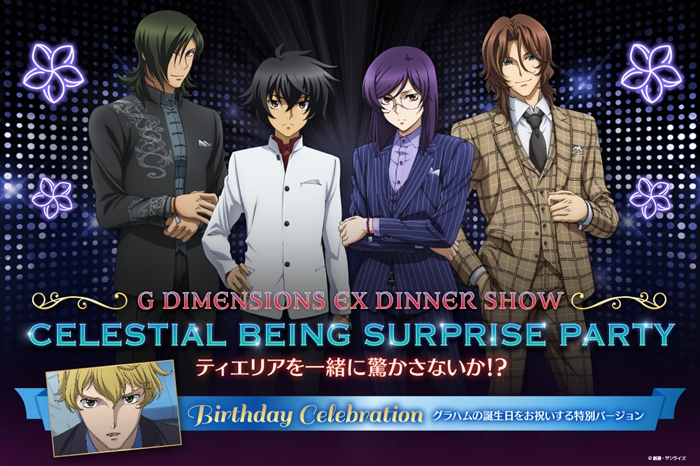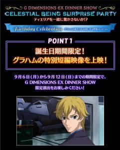 ระหว่างวันจันทร์ ที่ 6 กันยายน และ วันอาทิตย์ ที่ 12 กันยายน กันดั้มคาเฟ่ TOKYO จะจัดเวอร์ชั้นพิเศษของ CELESTIAL BEING SURPRISE PARTY ~Want to Surprise Tieria With Me?~ ฉลองวันเกิด Graham