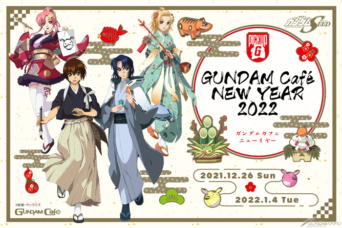 GUNDAM Café NEW YEAR 2022 เป็นงานแฟร์ที่คุณสามารถเฉลิมฉลองปีใหม่ไปกับคาแรคเตอร์ทั้งสี่จาก Mobile Suit Gundam SEED: Kira Yamato, Athrun Zala, Cagalli Yula Athha และ Lacus Clyne