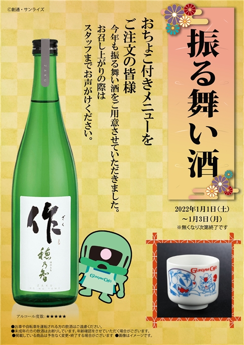 เมื่อเพิ่มเงินอีก 440 เยน (รวมภาษี) ของเมนูข้างต้นชุดใดก็ได้ จะได้รับ 2022 Limited Edition Chinese Zodiac Sake Cup ซึ่งเป็นถ้วยสาเกลายนักษัตรจีน (จนกว่าสินค้าจะหมด)
