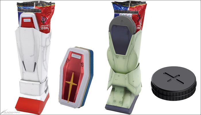 มีการบรรจุขนมและเวอร์ชัน Zaku รวมอยู่ใน กระป๋อง Zaku Machine Gun Drum ทรงกลม และเวอร์ชันกันดั้มมาพร้อมกับกระป๋องทรงโล่