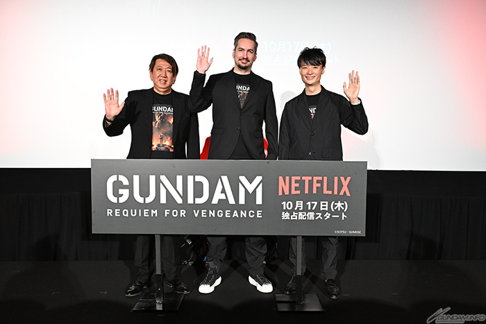 ในที่สุด Gundam: Requiem for Vengeance ก็เริ่มสตรีมทั่วโลกบน Netflix ในวันพฤหัสบดีที่ 17 ตุลาคมนี้ โดยงานฉายรอบปฐมทัศน์และเสวนาพิเศษเพื่อเฉลิมฉลองการเปิดตัวซีรีส์นี้จัดขึ้นในวันนี้ (วันเสาร์ที่ 12 ตุลาคม) ที่โรงภาพยนตร์ TOHO Cinemas Roppongi Hills ในโตเกียว