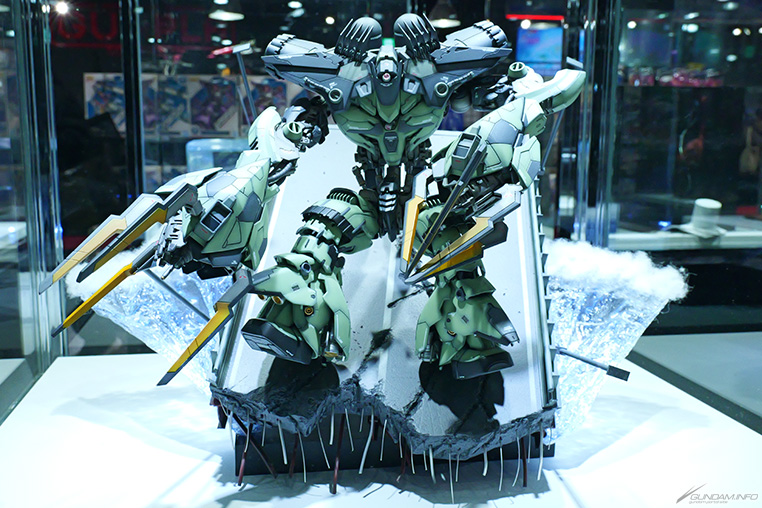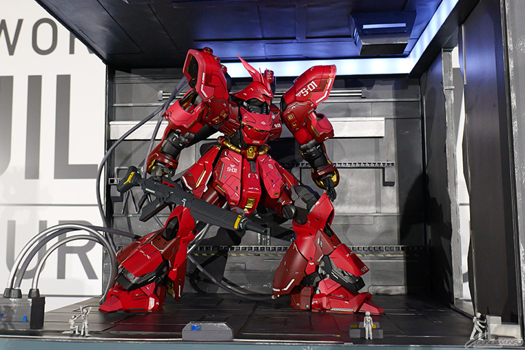 ความคิดเห็น: การสร้างชิ้นงานนี้ต้องเป็นเรื่องยาก เนื่องจากชิ้นงานนี้อิงจากฉากสำคัญที่แสดงถึง Sazabi อย่างไรก็ตาม กันพลาหลักของผลงานชิ้นเอกนี้ได้รับการประดิษฐ์ขึ้นอย่างพิถีพิถัน และเอฟเฟกต์แสงและโรงเก็บเครื่องบินโดยรอบก็สวยงามน่าทึ่ง โรงเก็บเครื่องบินได้รับแสงจากด้านบนด้วยไฟ LED และการออกแบบให้แสงส่องเข้ามาจากภายนอกได้ เพื่อสร้างการแสดงที่มีประสิทธิภาพโดยรวม