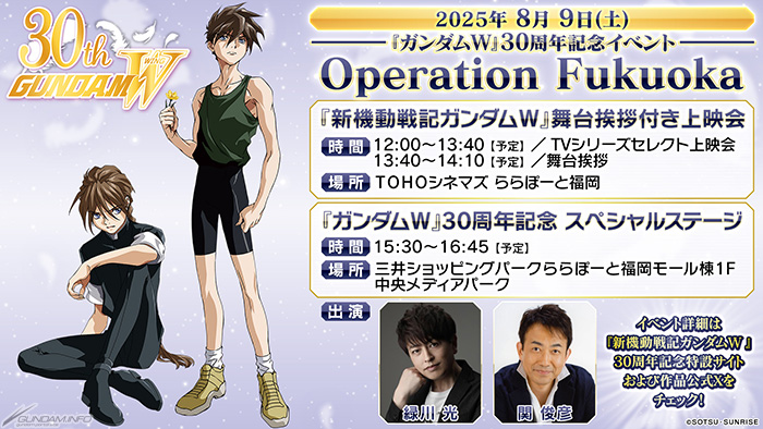 Hikaru Midorikawa และ Toshihiko Seki จะปรากฏตัวในงานฉลองครบรอบ 30 ปี Gundam W Operation Fukuoka ในวันที่ 9 สิงหาคม!