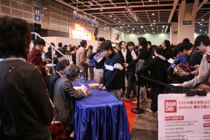ブース内のステージでは最新アイテムや、香港版ガンダムインフォの紹介が行われた。また、大河原邦男氏のサイン会も実施され、詰めかけた香港のファンと熱い交流が果たされた。(中国語では先生のことを「老師」と呼ぶ。)