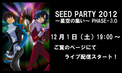 SEED Party 2012 Hoshizora no Tsudoi Phase-3.0, the third in a series of Mobile Suit Gundam SEED talk events, is this Saturday at the Tokyo Science Museum.