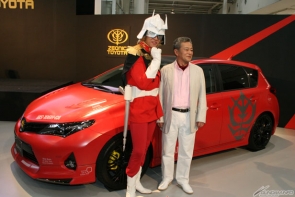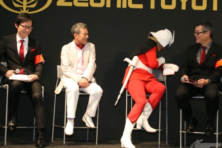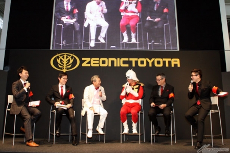 Next, two "advisors" to Zeonic Toyota were introduced: Shuichi Ikeda, voice of Char Aznable, and Numacchi, famous Char impersonator. Masahiro Matsumoto of Toyota Modellista, designers of the Char Custom Auris Concept and participants in the mass-production of the char Custom Auris, and Sunrise producer Shigeru Horiguchi also participated in a public discussion.