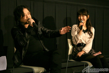 上映に先駆けて行われたトークショーは、檜山氏によるすこし遅い新年の挨拶と共にスタート。続いて井上さんも登場し、「皆さんこんばんは。アイナ・サハリン役の井上喜久子、17歳です♪ 揺れ動く17歳なので、夜の上映会なんて補導されちゃうかもと、ドキドキしています(笑)」とのおなじみの挨拶に、会場は大きな笑いに包まれた。