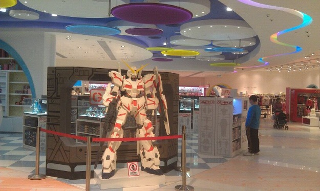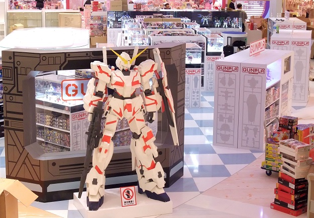An enormous statue of Gundam Unicorn and over 150 different models of Gunpla are displayed.