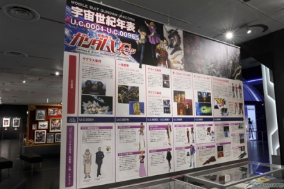 ▲資料だけでなく、1/10ユニコーンガンダムや宇宙世紀の歴史を振り返る巨大年表など、迫力の展示も盛りだくさん!