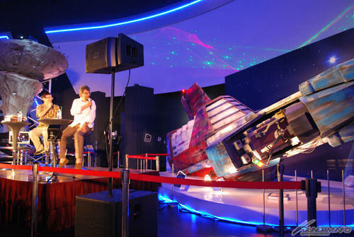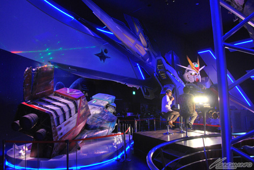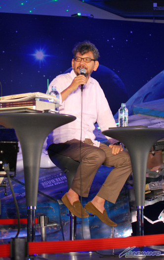 登壇してすぐに、傍らに設置されているコア・ファイターの巨大模型をまじまじと見つめる庵野さん。初めて見る巨大模型のコア・ファイターは、ディテールが気になっていたようだ。