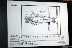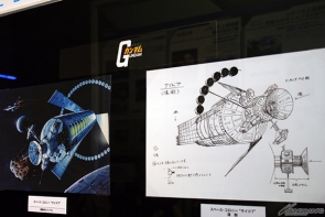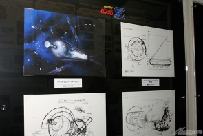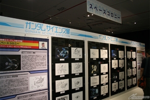 ▲歴代シリーズに登場する「スペース・コロニー」の設定画が並べられており、デザインの移り変わりが見てとれる。