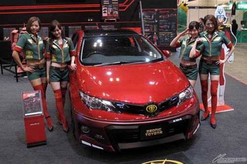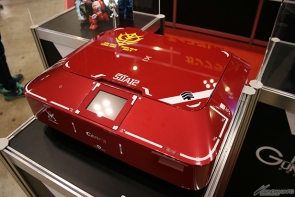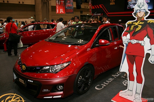 ▲先日の発表より大きな話題を呼んだ「シャア専用オーリス」市販モデルと、ジオン公国軍の制服をイメージしたコスチュームに身を包んだコンパニオンさんが来場者をお出迎え!
