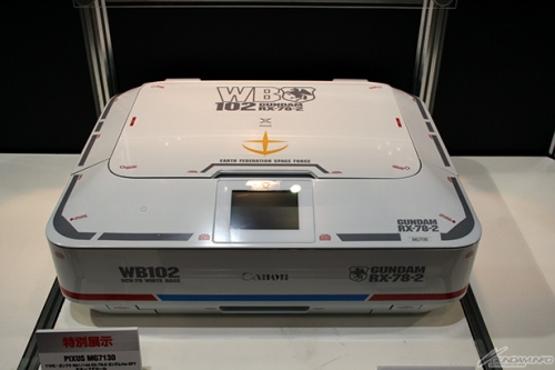 ▲4つのカラーの「PIXUS MG7130」を、それぞれ「WHITE = ガンダム」、「BLACK = ドム」、「BROWN = アッガイ」に見立ててデカールでカスタマイズ!特別展示となっているがぜひとも発売してほしい!