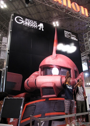 ▲『PIXUS×GUNDAM PROJECT』を先日発表したキヤノンのブースでは、PIXUSで制作した1/1スケールの実物大「シャア専用ザク(上半身)」グラフィックがお出迎え!