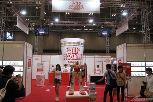 ▲日清食品のブースでは、カップヌードルカラーの等身大ガンダムを展示!