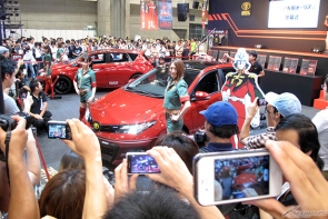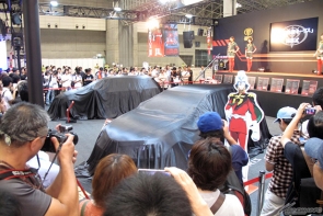 ▲初日の朝に行われたアンベールでは多くの来場者が詰め掛け、ついにその姿を現した「シャア専用オーリス」市販モデルに、多くのフラッシュが降り注ぐ!