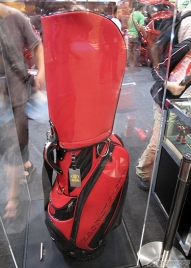 ジオニックトヨタオリジナルのキャディバッグには、モノアイをイメージした意匠が施されているぞ!