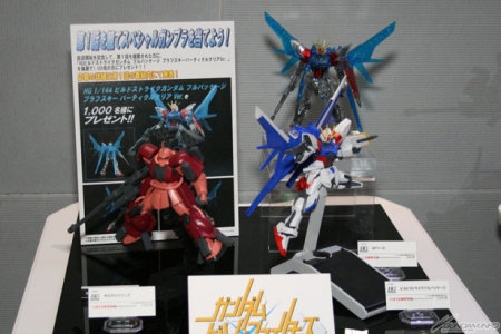 ▲好評発売中の「HG ビルドストライクガンダム」と「HG ザクアメイジング」に加え、第1話視聴者に抽選でプレゼントされる「HG ビルドストライクガンダム プラモフスキーパーティクルクリアVer.」の展示も。