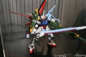 ▲1/10スケールのストライクフリーダムガンダムに加え、HDリマスター版で新登場した「パーフェクトストライクガンダム」や「ストライクルージュ オオトリ装備」のMGも展示!