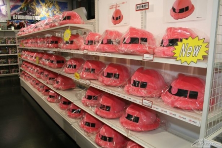 ▲同施設無料ゾーン内のオフィシャルショップでは、本日1月17日(金)より発売となった「シャア専用ザクッション」がずらり!