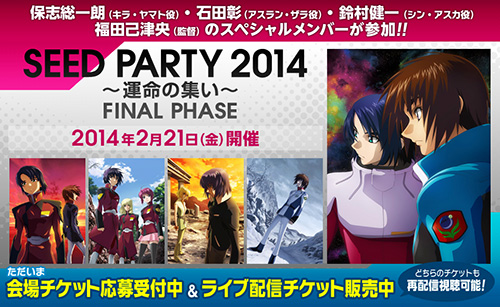 A second wave of tickets for "SEED PARTY 2014 - Sadame no Tsudoi: FINAL PHASE", to be held at Gundam Front Tokyo in Odaiba on February 21st, goes on sale January 20th.