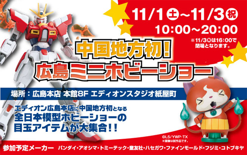 中国地方では初展示となる最新ホビーアイテムが勢ぞろいする「広島ミニホビーショー」は、11月1日(土)から3日(月・祝)の3日間、「エディオン広島本店 本館8階特設会場」にて開催される。