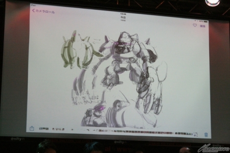 片貝氏自身も描いているうちに盛り上がり、水中では水亀形態に、陸上ではゴリラ形態に変形する機体としてデザインしたものの、変形機構を持つMSが出現するのが『機動戦士Ζガンダム』の時代からだということで、結局無しになったという裏話も飛び出した。