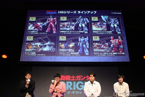 First up was a look at the ongoing series of The Origin Gunpla. Commenting on the lineup on screen, Mr. Okamura mentioned that he "never expected to see the High Mobility Zaku in action", and producer Taniguchi noted that "(the Zaku's) appearance in part 1 was a specific request from general director Yasuhiko. We were confused at first, but now I'm glad we put it in."