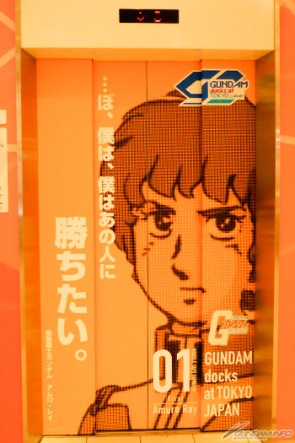 ▲นอกจากจะถูกปิดไปด้วยผลงาน Mobile Suit ที่หลากหลายในทุกๆ ที่แล้ว, แม้แต่ประตูลิฟท์ก็ยังออกแบบมาให้เล่นกับบทพูดของคาแรคเตอร์อีกด้วย