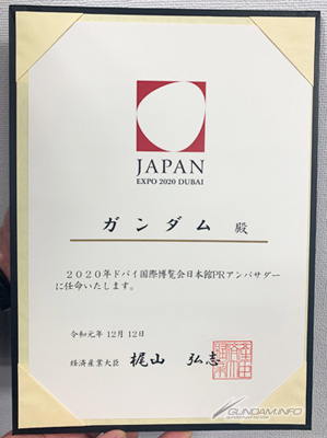 บุคลากร 7 ท่านจาก 14 สาขา รวมถึง "Gundam" จาก "Mobile Suit Gundam" จะได้รับเชิญในฐานะอุปทูตประชาสัมพันธ์ศาลาญี่ปุ่น (Japan Pavilion PR Ambassador) ในงาน “2020 Dubai International Exposition” (เรียกกันในชื่อ "Dubai Expo") เพื่อฉลองครบรอบ 50 ปีของ สาฐารณะรัฐอาหรับเอมิเรต