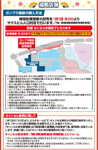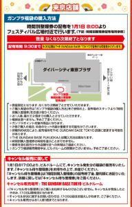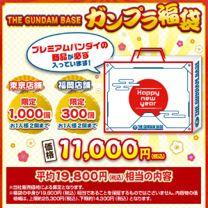 "Luxury Gunpla Lucky Bag" (1,100 เยน รวมภาษี) มีวางจำหน่ายในแบบจำนวนจำกัด ภายในมีสินค้าเฉลี่ยมูลค่า 19,800 เยน (รวมภาษี) ซึ่งมีไอเทมจาก Premium Bandai ด้วย วิธีการซื้อ จะมีการแจกบัตรคิวหนึ่งชั่วโมงก่อนเริ่ม ที่บริเวณ "Festival Square" เวลา 8.00 น. ของวันปีใหม่
