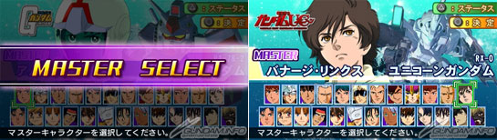 前作まではマスターキャラクターとして歴代ガンダム作品の主人公キャラのみ選択可能だったが、今作より新たにライバルキャラクターの選択も可能となる。