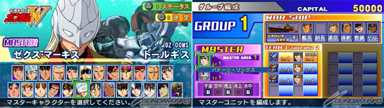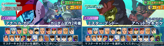 ステージ攻略を進めていくことで、マスターキャラクターを選択できるようになる「マスターセレクト」では、選択すると編成できるグループが1つ追加され、マスターキャラとMSが「マスターエリア」に登録される。