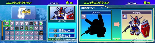 今作では「ジージェネ」シリーズの楽しみの一つである機体収集がパワーアップされ、ユニットの収集率の確認ができるほか、開発・設計の幅を広げるためのヒント機能を搭載した「ユニットコレクション」が搭載される。
