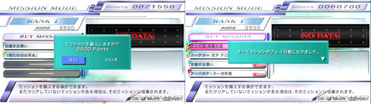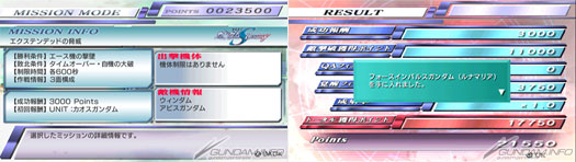 In Mission mode, the player starts with a limited selection of mobile suits, and as play progresses unlocks new suits and maps for the multiplayer mode. Missions appear randomly after being bought with in-game points. In addition, after clearing a few normal missions, 'Key Missions' appear in which a clear allows you to purchase the next-higher difficulty level.