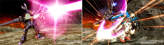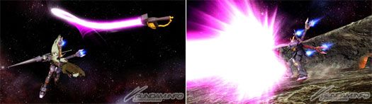 ▲ Left: Its sub ranged attack is the Beam Saber & Beam Zanba Throw. Right: Its special ranged attack is the massively-powerful Jupiter Empire Buster Launcher.