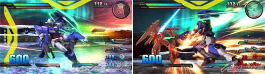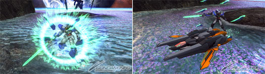 ▲ In normal mode, the special ranged attack produces a protective GN Field around the suit. In Quantum Burst, it summons the flight-mode Gundam Harute, which flies toward the enemy while firing its GN Cannon and GN Missiles.