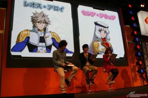 本作より堂々参戦する「GUNDAM EXA」のメインキャラクターを演じる「レオス・アロイ」役の声優・岡本信彦氏と、「セシア・アウェア」役の竹達彩奈さんをゲストに迎え、実施されたスペシャルステージ。