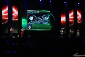▲ステージでは、4月5日(木)発売予定のPSP®専用ソフト「第2次スーパーロボット大戦Z 再世篇」の第2弾PVが上映された。スクリーンに参戦作品が次々と映し出されると会場のファンからは大きな歓声が上がった。そして上映後もしばらく、会場のどよめきが収まらない様子だった。