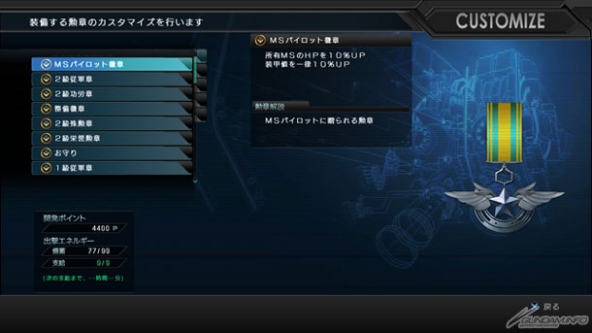 カスタムパーツには、それぞれに効果が異なる様々な種類があり、MSの利点を強化したり、弱点を補ったりと、プレイヤーが自由にカスタマイズすることができる。