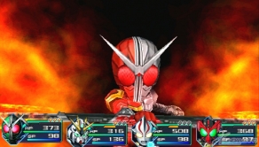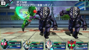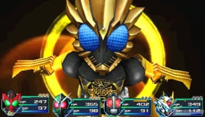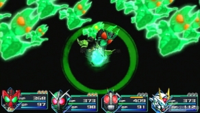 ▲スキル攻撃「ガタキリバキック」(左)と「ラトラータークロス」(右)。オーズは使うスキルに応じて、フォームチェンジを行う。