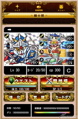 Knight Gundam Carddas Senki retells the tale of the Knight Gundam characters, heroes of a whole generation. Players progress through the story by completing missions and challenging bosses.